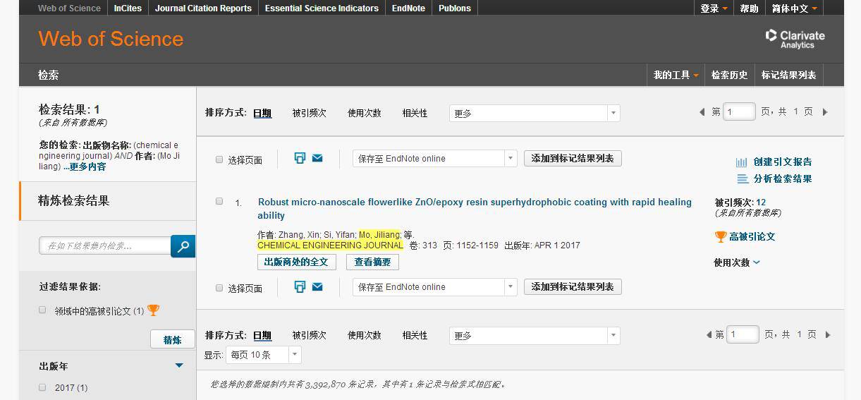 根据美国科技信息所(ISI)基本科学指标数据库(ESI)最新数据显示,公司硕士研究生张鑫(其导师为摩擦学研究所莫继良研究员)于2017年4月在《CHEMICAL ENGINEERING JOURNAL》(影响因子:6.216)上发表的第一作者论文“Robust micro-nanoscale flowerlike Zno/epoxy resin superdrophobic coating with rapid healing ability”入选ESI“高被引论文”。