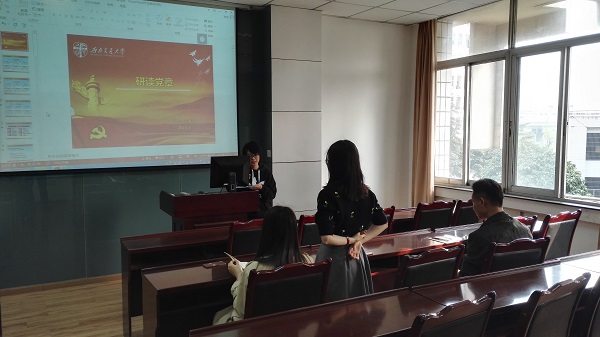 3月28日下午3时,机械公司2017级研九班党支部全体成员在逸夫楼2311室共同学习了在党的十九大会议上修订后的《中国共产党章程》。党支部书记眭洋同志提醒大家,要将学习贯彻维护党章与“两学一做”结合起来,切实做到学其“本”、会其“义”、遵其“规”。