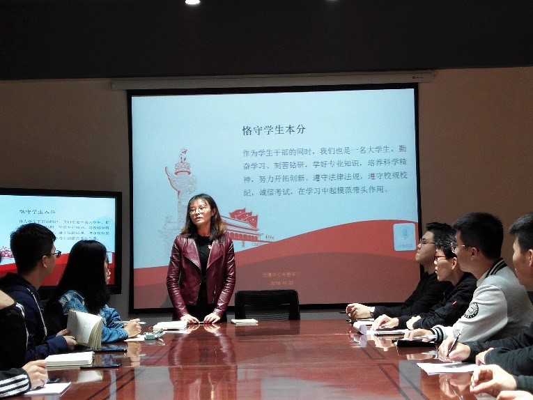 迎百年机械,为营造良好的员工组织氛围,树立正确的员工干部作风,机械团建中心于2018年10月22日21点在X2201组织进行了以“忠诚担当听党话,奋斗清廉树人生”为题的干部学习会议。机械团建中心指导老师邓慧心到场主持会议,团建中心主任及部长到场学习并分享学习心得体会。