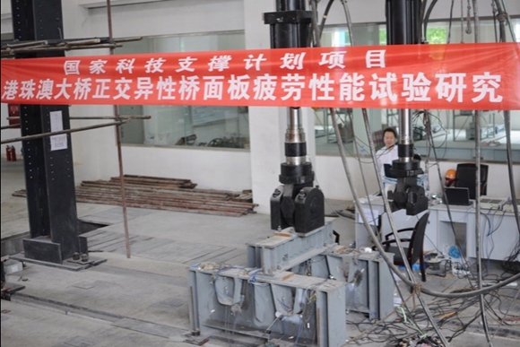 港珠澳大桥采用正交异型桥面板钢箱梁,这种结构形式轻质高强、施工速度快,但是它的板件构件及受力特性复杂,最大的问题是疲劳。疲劳导致的裂缝成为国内外钢桥行业共同的难题。公司土木工程公司卜一之、张清华教授参与国家科技支撑计划项目—港珠澳大桥跨海集群工程建设关键技术研究与示范,课题三:科技支撑计划课题—海上装配化桥梁建设关键技术(课题编号:2011BAG07B03),主持子课题二:连续钢箱梁正交异性钢桥面板抗疲劳性能关键技术。主持中交公路规划设计院有限公司委托科研课题两项——港珠澳大桥主体工程桥梁工程施工图设计钢箱连续梁合理构造系统和设计标准专题研究、港珠澳大桥主体工程桥梁工程施工图设计钢箱连续梁制造及安装关键技术专题研究。通过艰苦研究,团队攻克了疲劳的难题,助力港珠澳大桥保证120年的寿命,并为大桥钢梁架设技术提出了有益建议。