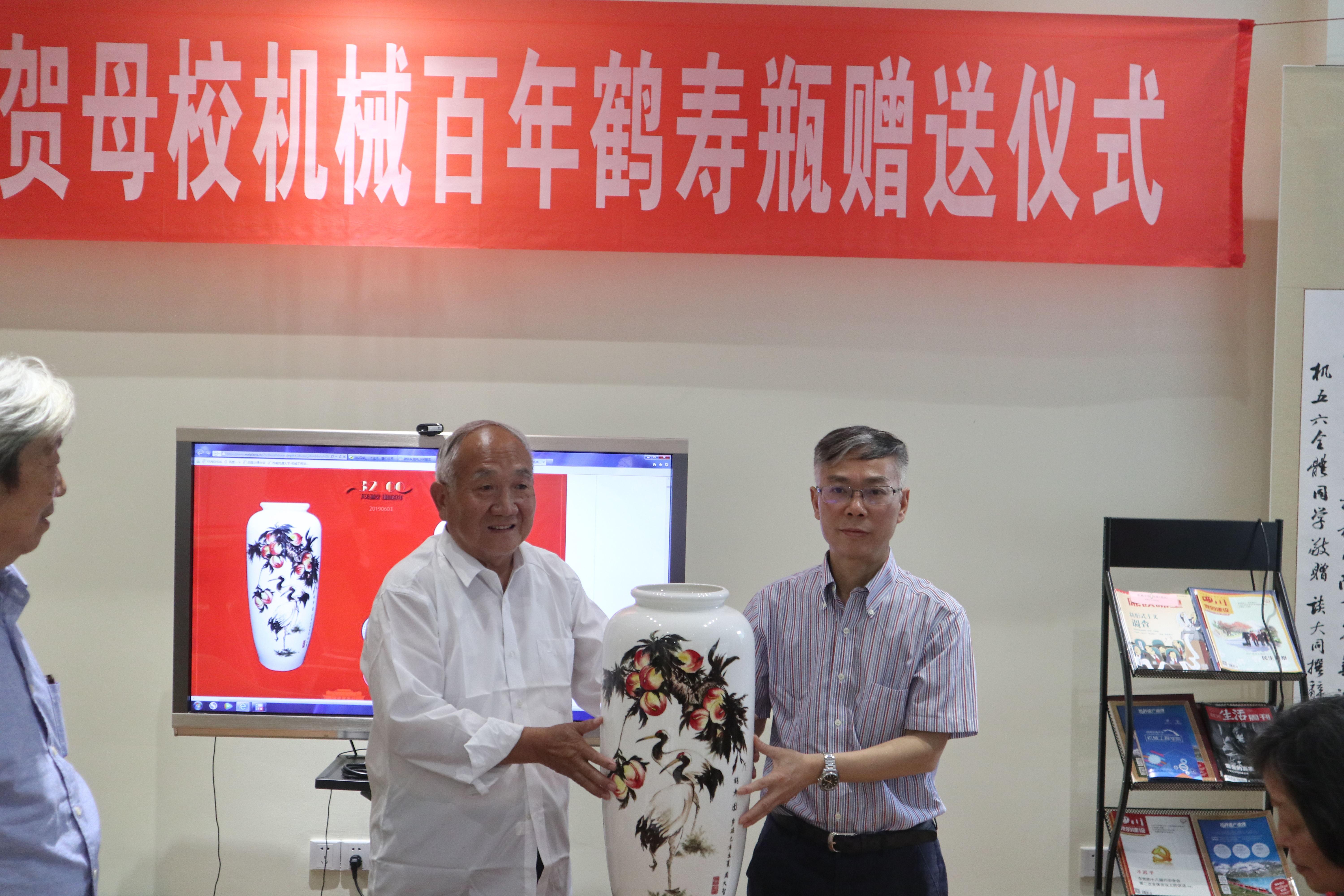 随后,员工代表详细介绍了蟠桃贺寿瓶及其由来。为庆贺母校机械学科创建一百周年诞辰,唐院员工微信群内的一百四十多位员工决定为母校献礼。蟠桃贺寿瓶由63届员工贾鸿光负责总设计,其上贺寿图由63届员工周大智创作,在唐山陶瓷研究所煅烧5遍,历经30天而成。制作材料用唐山水,唐山土,制作过程中请唐山师傅,用唐山手艺,代表了唐院员工对母校浓厚的感情。