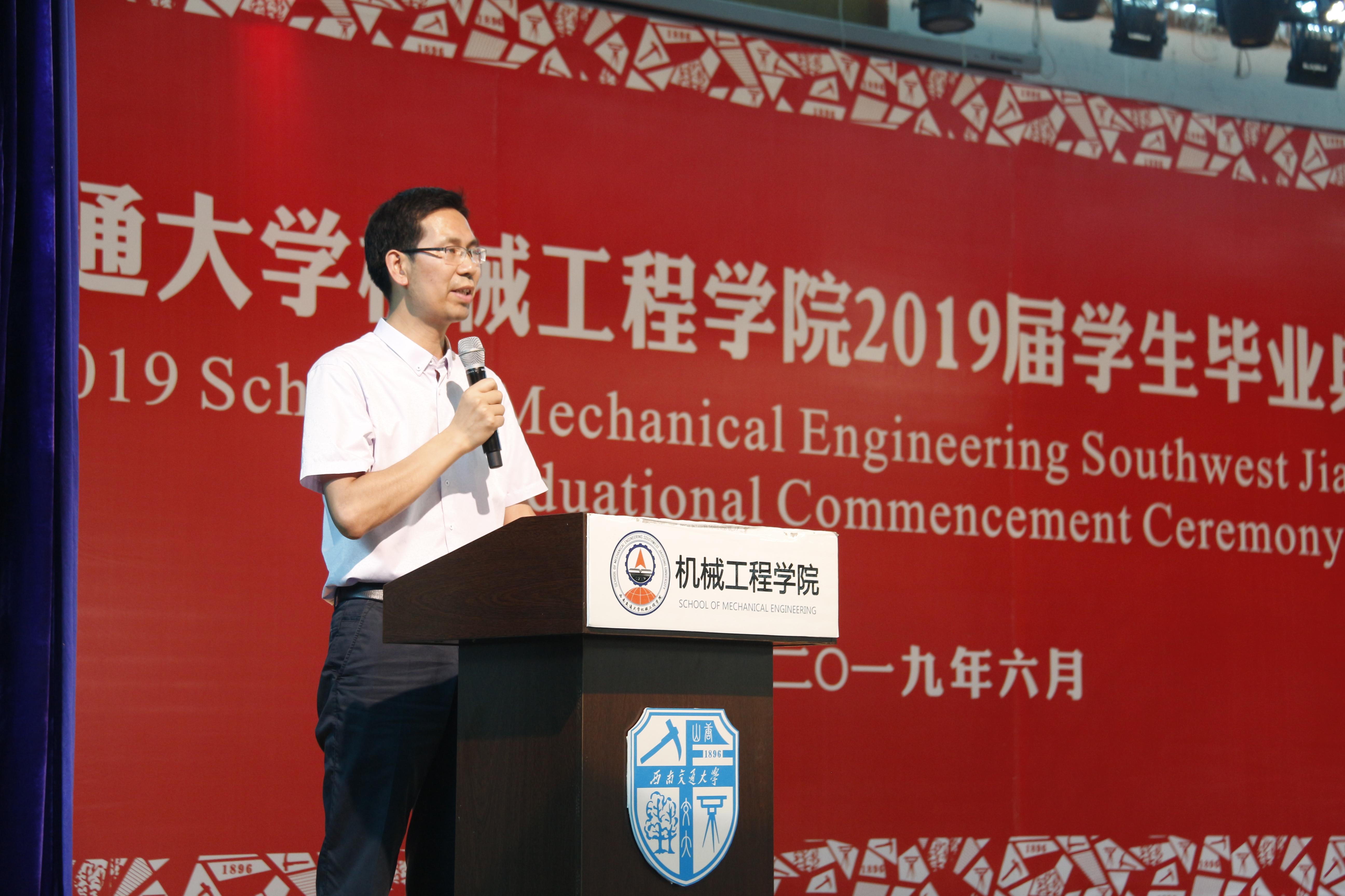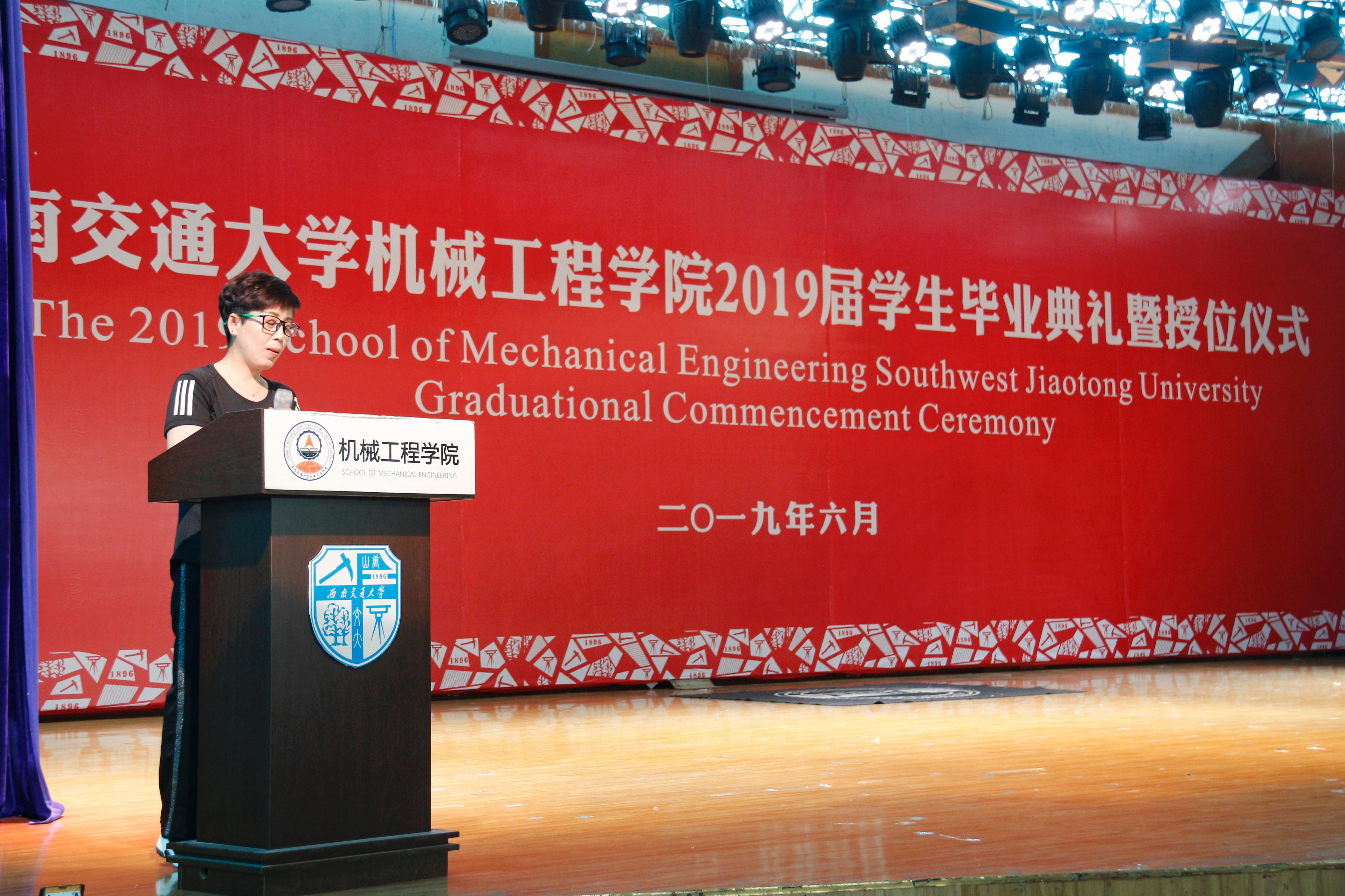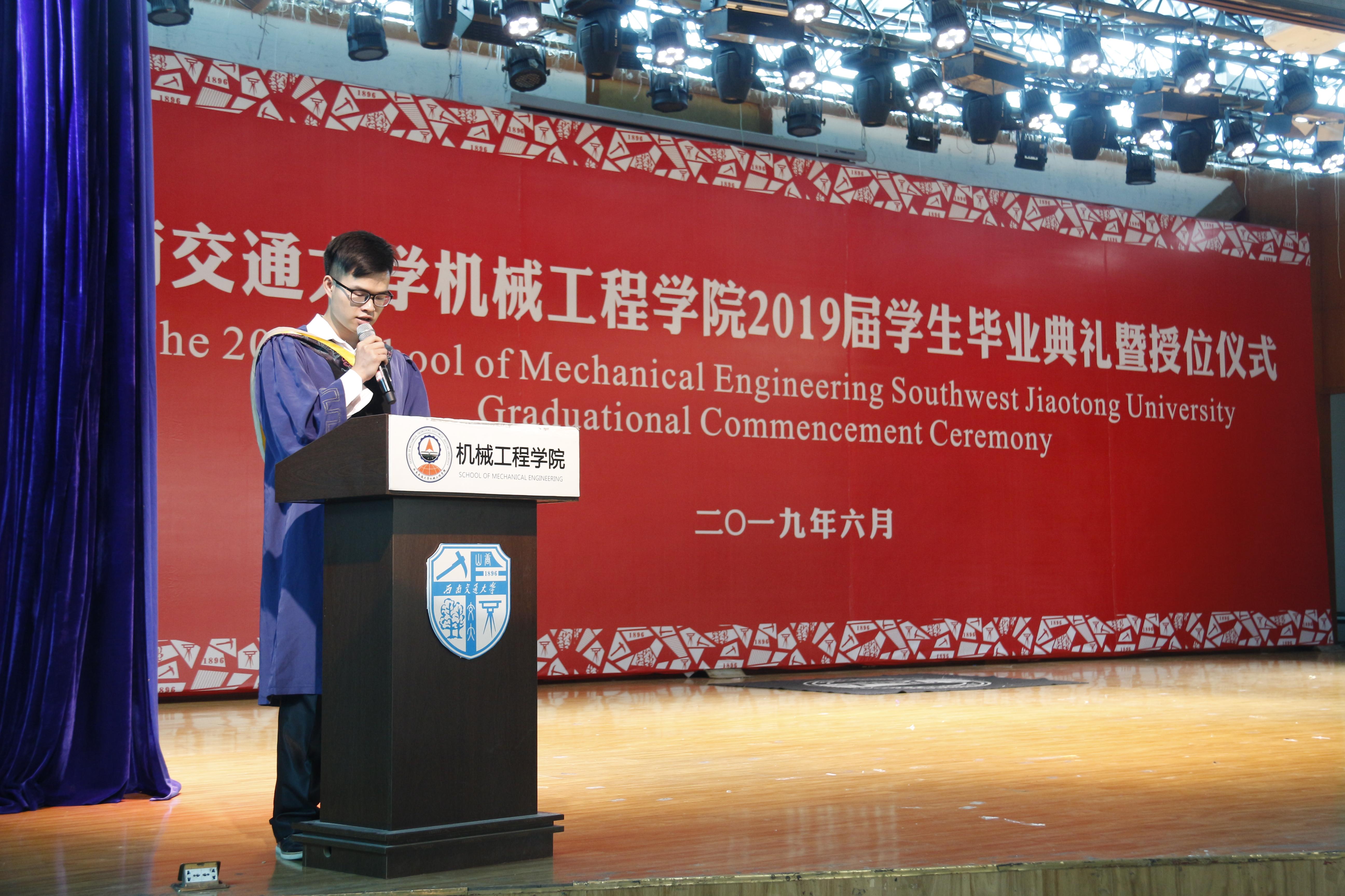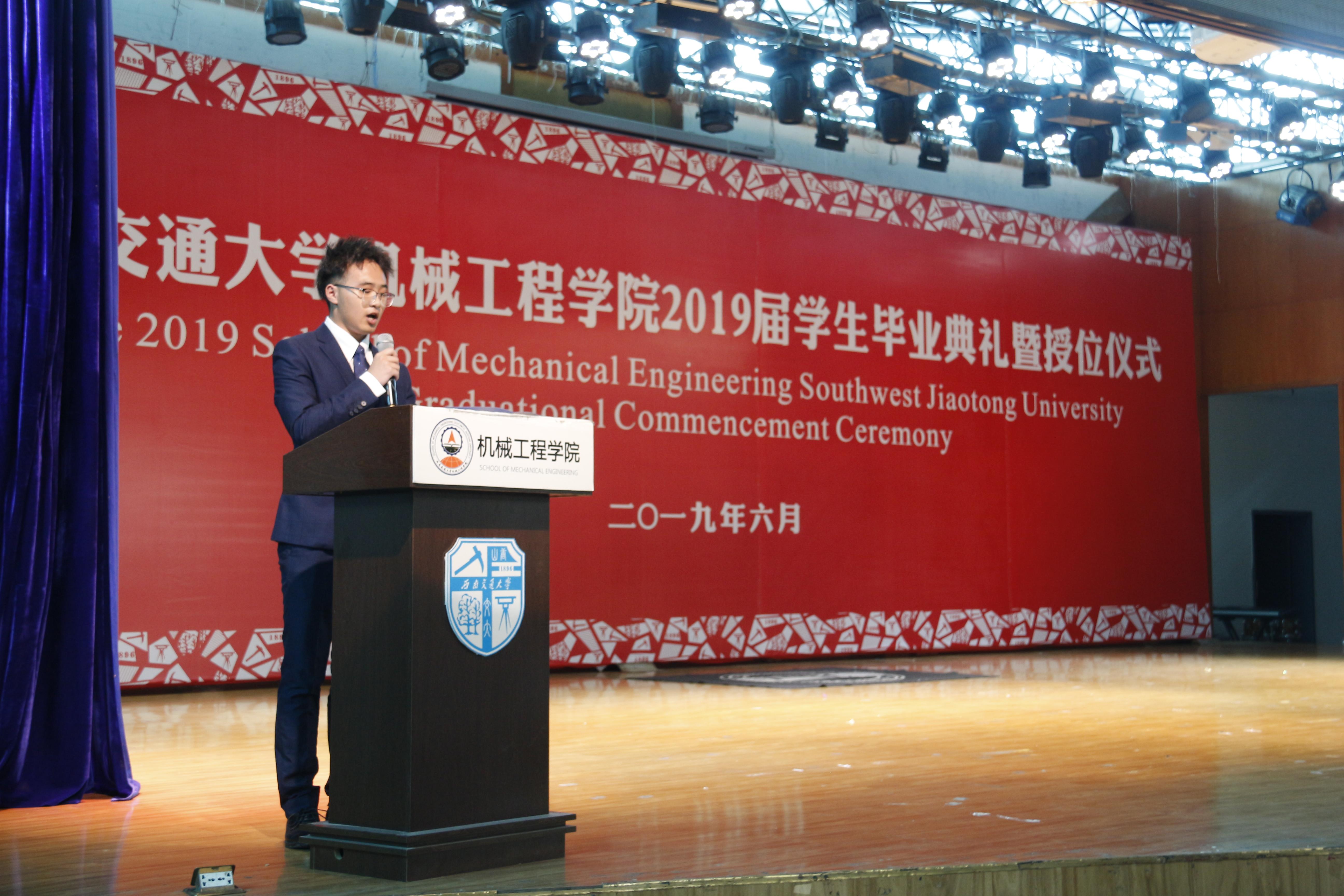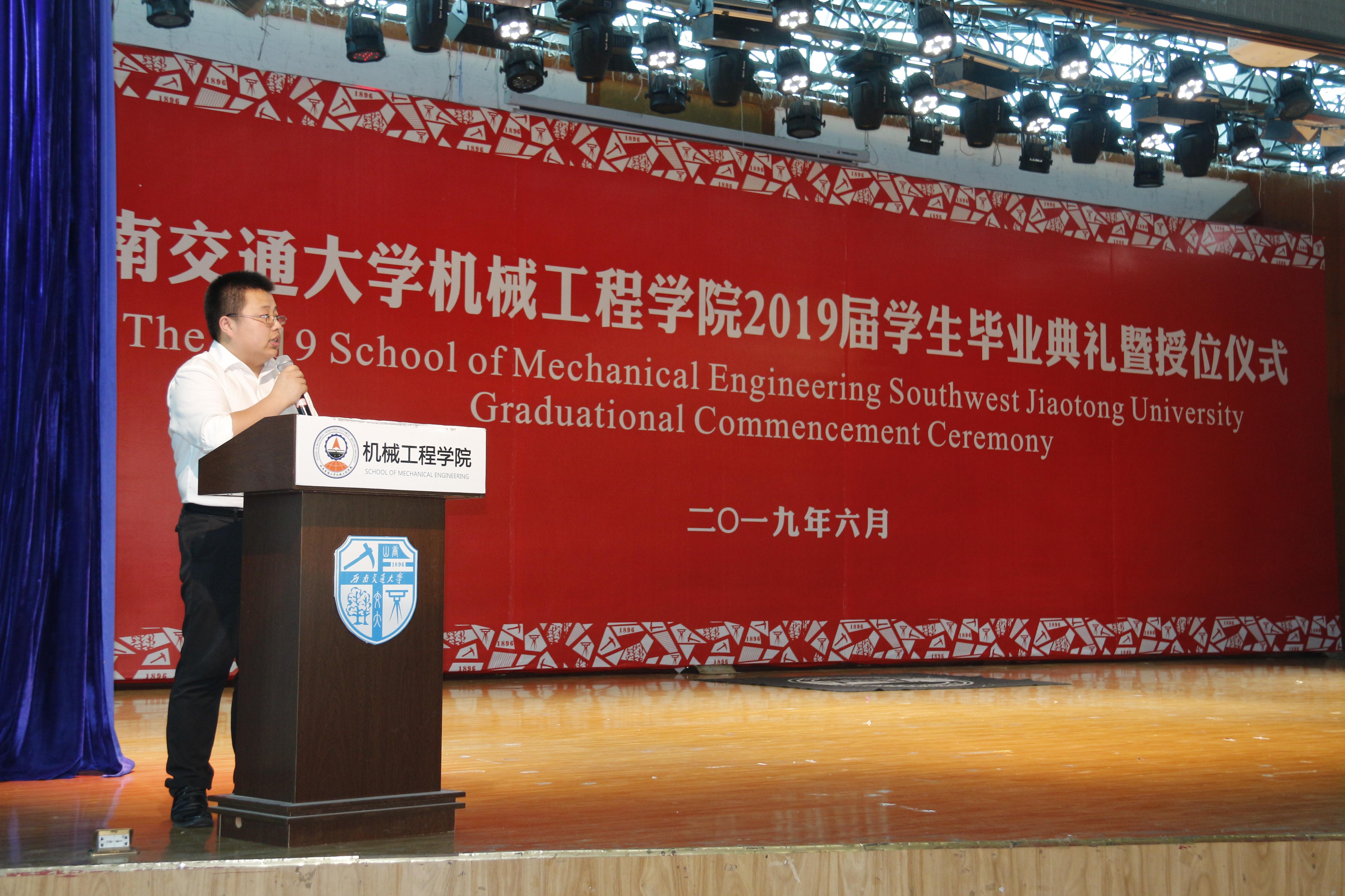 接下来,校学工部副部长、原公司党委副书记李毅为毕业生送上情深祝福,本科生舒柏瑞、研究生骆传宇两位同学作为毕业生代表发言,黄运华老师作为班导师和任课教师代表发言,杨怀银老师作为毕业生辅导员代表发言,2019届毕业生曹奥同学母亲张丽英女士作为家长代表发言。