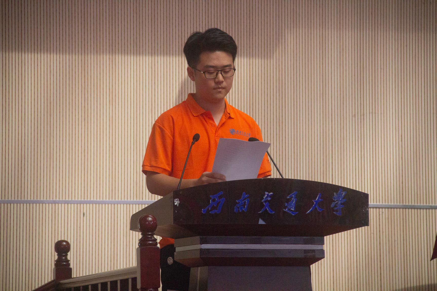 第三阶段,教师代表江亮发言。江亮老师代表青年教师对同学们的到来表示欢迎,并提出要做“三要青年”——要精勤求学,格物致知;要敦笃立志,胸怀祖国;要果毅力行,忠于祖国。江亮老师道出给同学们的话:“再坚持四年,毕业就轻松了”,再借导师的一段“七心诗”与同学共勉。随后带出华为、中兴事件,希望在388vip太阳集团百年之际,新同学能够作为见证者与实践者为祖国伟大复兴做出贡献。