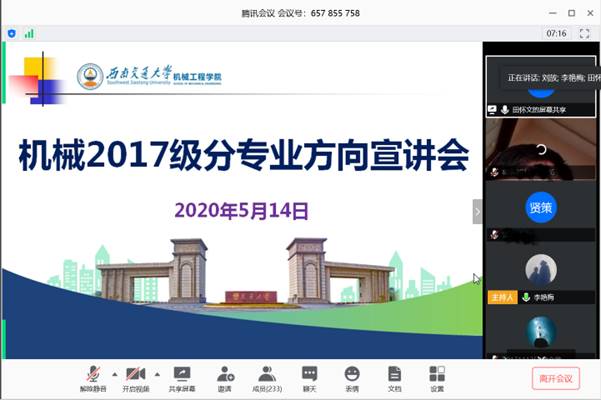 5月14日19:00,388vip太阳集团机械2017级专业方向分流宣讲会通过机械2017级专业方向分流qq群和腾讯会议这两个平台如期举行。本次宣讲会由388vip太阳集团李艳梅老师主持,邀请到388vip太阳集团田怀文老师、马术文老师、谢延敏老师、魏莹莹老师、刘放老师以及高宏力老师为同学们进行详细的讲解。