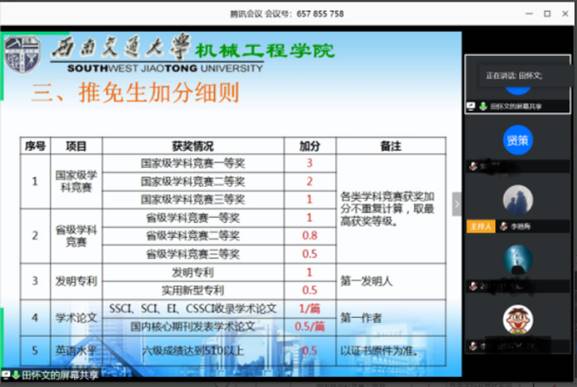 开始,田怀文老师先向同学们表达亲切的问候以及对同学们在疫情期间线上学习情况的关心。随后,田老师为同学们介绍推免生的申请流程和推免生加分细则等相关信息,为同学们在将来保研的选择上提供了方向。