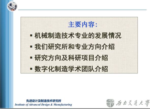 首先开始介绍的是机械制造及自动化专业的马术文老师。他主要针对机械制造技术专业的发展方向、科研方向、科研项目以及数字化学术团队等相关内容进行详细的介绍。介绍结束后表达了对大家加入本专业的美好期望。