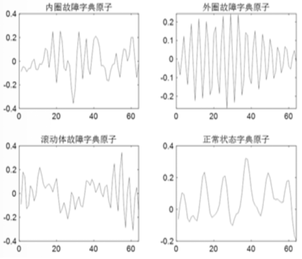 实验验证过程中我从正常状态、内圈故障、外圈故障和滚动体故障四种类型的训练数据中每类选取10240个数据点,并将每类数据分解成64×160的样本集。基于每类样本集,采用K-SVD算法训练出正常状态、内圈故障、外圈故障和滚动体故障四类过完备字典。