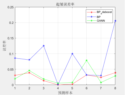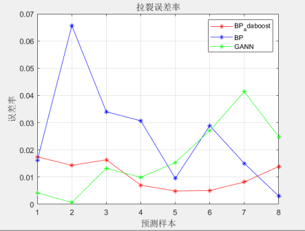4、将样本分为训练集和测试集,利用matlab软件,基于训练集,构建神经网络预测模型(BP_AdaBoost)并利用测试集对模型的泛化性能进行测试,结果显示该模型对方盒件以及翼子板的成形质量预测精度均达到要求,并将构建的神经网络模型与其他智能算法优化的BP神经网络模型进行对比。