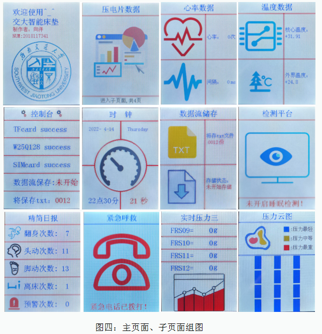 该微信小程序可以实现多种功能,包括上传数据到数据库,从数据库中拉取数据;与单片机通过BLE蓝牙设置建立通讯;获取单片机传过来的传感器的实时数据并显示在相应界面;个人中心界面以及配套的各种小功能,历史查询,床位绑定,客服,地图查看等;亮度调节,图片查看,视频查看,发送弹幕4等;查看当日睡眠报告,查看周报等;蓝牙控制单片机等。除了以上的导航栏主页面,在每一个页面下还有很多子页面,在这里展示部分子页面,组图如下图图九: