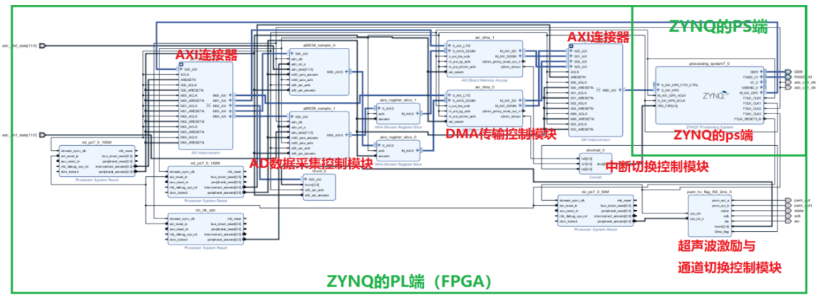 如图7 FPGA模块RTL原理图,其工作流程大概为:激励信号与采样通道控制模块负责输出激励信号以及通道的切换,AD9238采样模块负责控制外部AD采集模块采集数据,采集到的数据经过DMA控制模块以DMA数据传输方式把数据传输到PS的内存DDR之中去。在PS之中,ARM把数据从内存DDR中读出,计算渡越时间,把计算结果通过以太网控制器Ethernet0发送给上位机。下面对各个模块进行简单介绍: