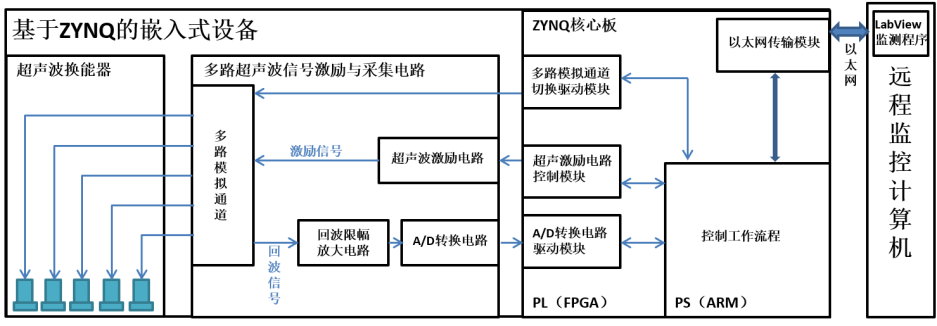 (1)超声波探头的选型。(2)设计、调试超声波采集调理电路,具体包含:滤波放大电路、A/D转换电路、多路模拟通道等。(3)嵌入式系统核心控制器的选型:本次毕业设计选择ZYNQ作为嵌入式系统的核心控制器。