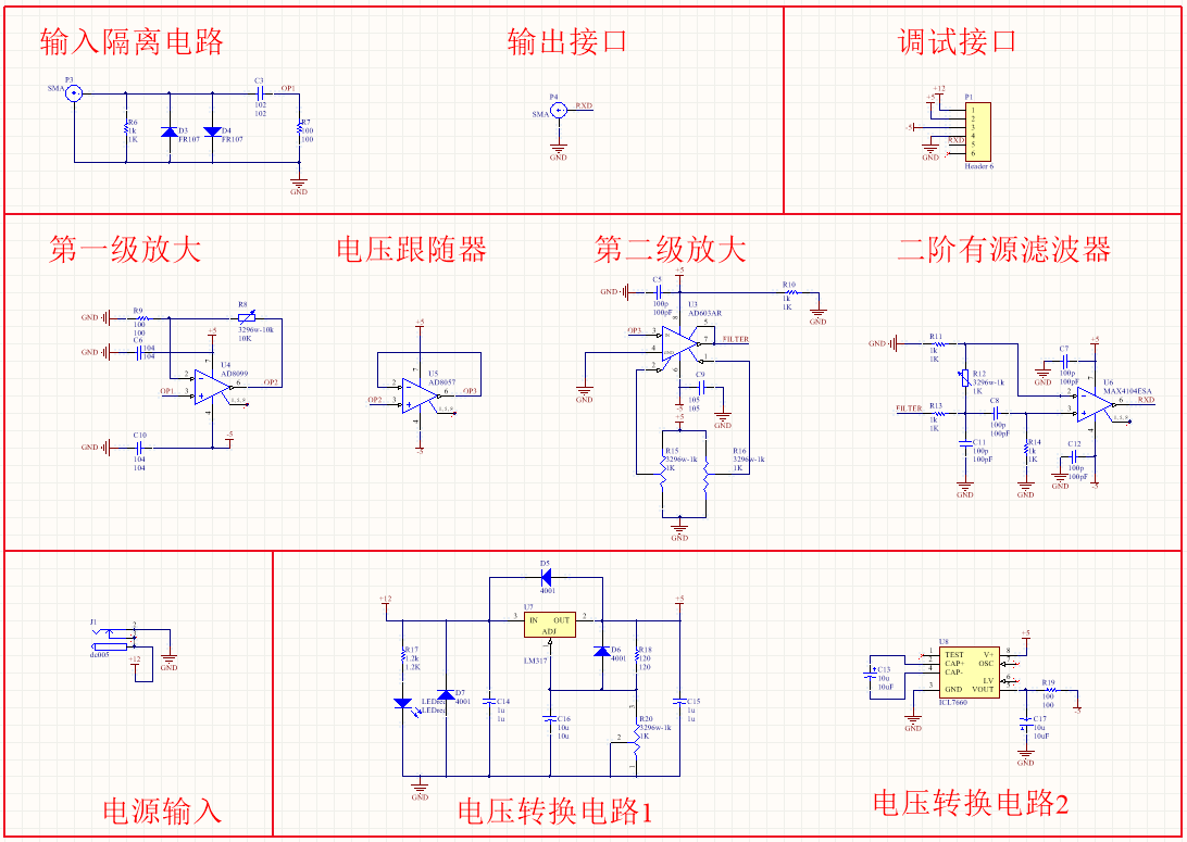 放大滤波电路由两级同相比例放大电路、一级电压跟随器、一级滤波放大电路构成,可以将频率为5MHz、峰峰值为几十mV左右的超声回波信号放大至+-5V。