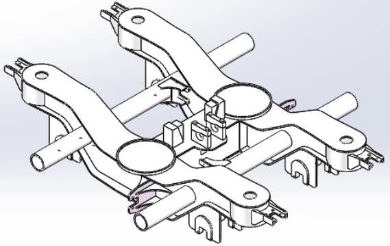 提前考虑了各部件的几何尺寸及空间相对位置,在构架上设置了横向止挡、牵引拉杆座、抗蛇行减振器安装座、横向垂向减振器安装座以及转臂安装节点座。为了外侧实现轴盘制动,对构架进行相应设计安装外侧吊挂制动装置。