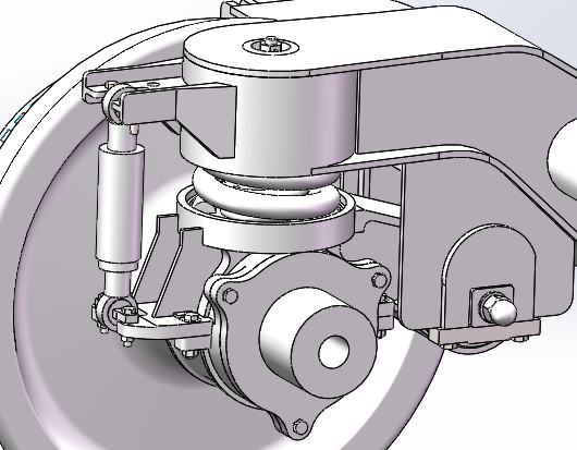 采用橡胶弹簧,配置横向减振器、抗蛇行减振器。由于内轴箱的布置形式,悬挂中心距相比常规布置缩小了50%,虽然利于曲线通过,但其抗侧滚刚度降低,运行是侧滚角位移大大增加。这不但会使车辆运行时超出限界,极端情况下可能发生倾覆,所以必须配置抗侧滚扭杆。为了节省空间,采用简单的单拉杆牵引模式。
