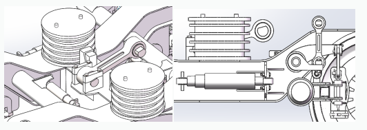 由于内轴箱式转向架空间限制,采用外侧轴盘制动模式。制动夹钳悬挂方式采用三点式悬挂。