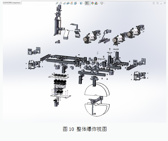 整体一共由700余个零件组成。主框架使用型材,因为型材力学特性好,能够承受比较大的力而不变形,从而不对机构运行产生影响。零件的主要连接方式为螺栓螺母连接。如图10,为整体模型的爆炸视图,一共有7个机构以及一个整体框架组成。