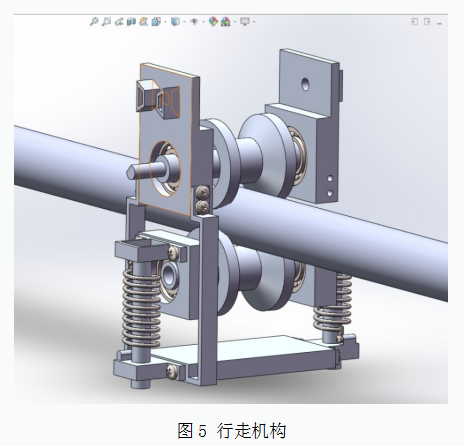 (2)行走机构:如图5,本来打算只用一个轮子的,后来想到,由于整体机器人重型难控制,有可能会发生微侧身的情况,所以在底下又加了一个轮子,并且用弹簧进行夹紧,这样能够应对这样的情况。并且,在另一侧上下轮之间没有障碍,使得机器人能够从左往右上线,不用繁琐的操作,这样有利于工人在实际情况下进行操作。