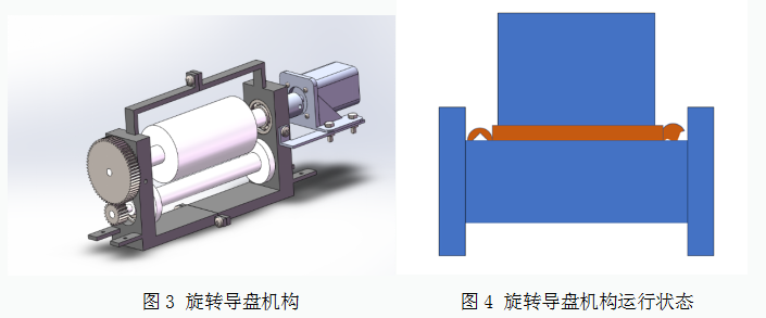 (1)旋转导盘机构:如图3所示,由上下两个滚筒组成,下滚筒两侧还有挡板,防止绝缘带偏离,如图4即为旋转导盘工作时候的状态。左侧有齿轮啮合,能够保证上下滚筒能够以同等的转速进行转动。整体框架是由左右两部分组成,这样能够方便安装,电机由右侧输入动力。