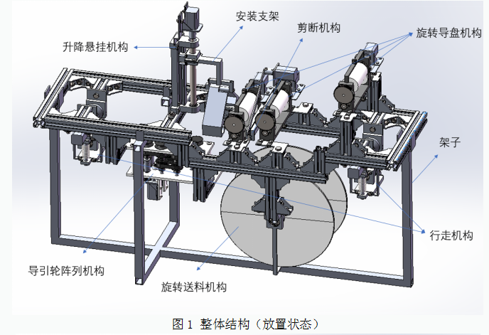 以下就是我设计的机器人的模型,如图1,是机器人在闲置状态,机器人放置在专门设计的架子上,以便放置以及取用。如图2,是机器人在工作的时候的状态,绝缘橡胶就绕在最底下的圆柱上,内部有传送机构、夹断机构、升降悬挂机构等。运行的过程为:绝缘橡胶从右侧传送进入内部,然后有一个类似夹子的活动装置中间有弹簧,当需要工作的时候升降悬挂机构下降,使得绝缘橡胶能够初步包裹导线,然后再卷入导引轮阵列机构完成包裹。当工作完成,由夹断机构剪短绝缘橡胶。