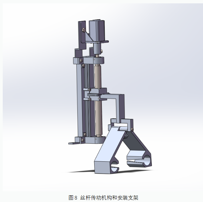 (4)丝杆传动机构以及安装支架:如图8,上部有一个步进电机,控制丝杆转动,丝杆上连着安装支架,安装支架左右支架之间有弹簧,使得自然状态下处于张开状态。在工作的时候,绝缘带从左侧进入,通道由宽变窄,使得绝缘带被夹住,然后丝杆控制安装支架往下移动,绝缘带碰到导线之后,支架会受力收紧,完成初步包裹。