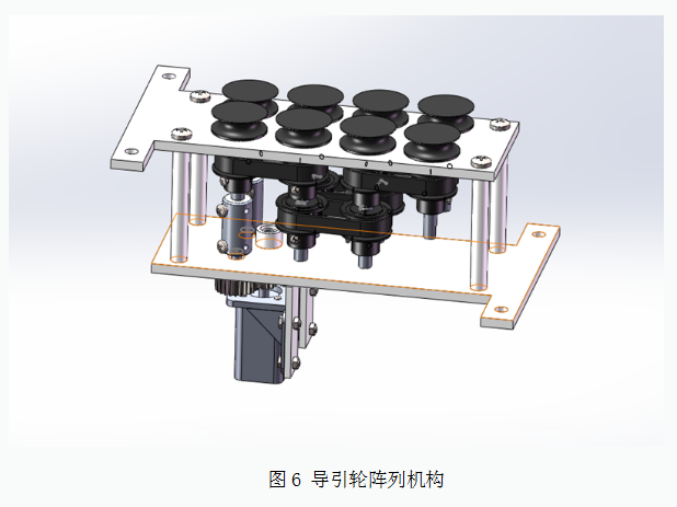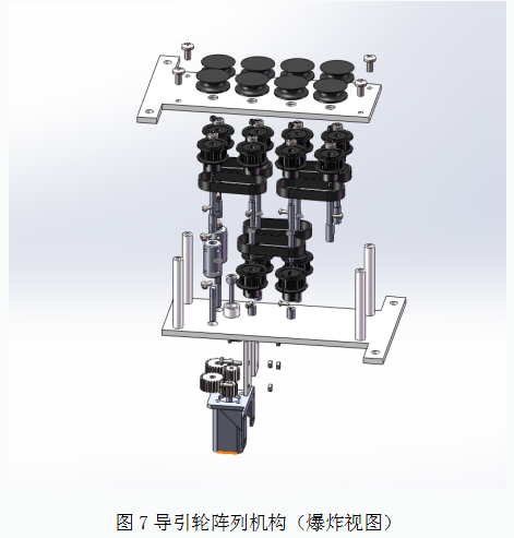 (3)导引轮阵列机构:如图6,通过一个步进电机,再加上齿轮传动,使得两侧导引轮能够互为反方向旋转,从而能够传送绝缘带同时进行包裹。导引轮是通过螺纹连接到轴上的,所以控制螺纹旋向,使得导引轮在工作过程中,处于被拧紧状态。如图7,导引轮之间的联动,是通过同步带进行传动的,使得各个导引轮转速相同。