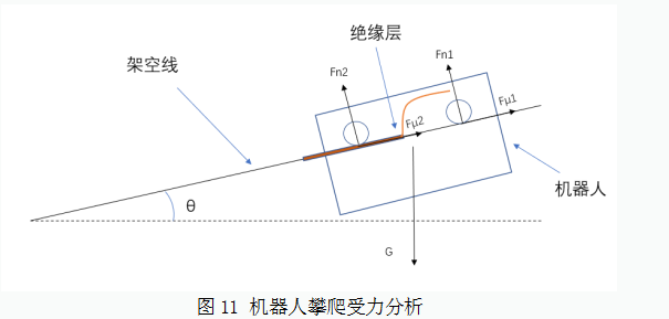 由于在作业的过程中,架空线存在一定的垂度,所以设计要求机器人有一定的攀爬能力,查阅资料可得,当机器人有15°的攀爬能力的时候,机器人能在大多数的架空线配电线路上工作,所以以攀爬15°为设计要求,来进行分析。如图11所示。