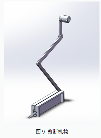 (5)剪短机构:如图9,步进电机从上端联轴器输入扭矩,电机座在另一个旋转导盘机构上,控制各杆的长度,使得一刀片一端为摆动副,使得刀片能正好完成剪断操作后就恢复打开状态。剪断机构前后有两个旋转导盘机构来保证绝缘带能够准确地输送进剪断机构,并且剪断之后进行下次修补的时候能够很好的再进行运行。
