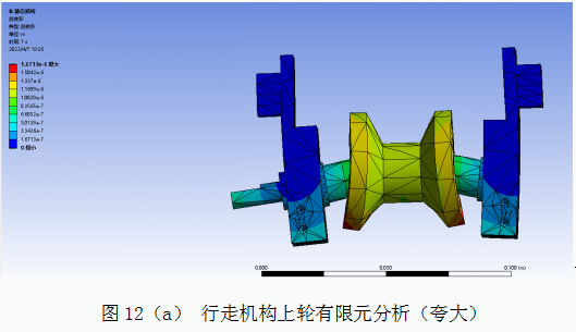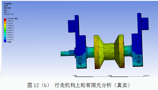 整个机构中,最危险的受力最大的机构就是行走机构,现在用Ansys Workbench对行走机构的上轮装配体进行力学分析,图12(a)为夸大情况下的变形显示,图12(b)为实际的变形显示,从图像可以分析出最容易变形的地方在轮子与架空线接触的地方,以及中间轴的变形。但是从真实的变形图可知,主要为轮子变形,轴的变形非常小。虽然轮子变形相对最大,但实际变形是很小的,最大的地方为1mm,对整个机器人不会造成影响,但是在下一步工作中可以通过加厚中间轮来使得变形变得更加小。