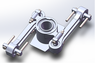 牵引装置采用牵引中心销配合双牵引拉杆的方式连接构架横梁与枕梁,传递纵向力。设计时,牵引拉杆两端螺栓垂直交叉排列,销连接可自由转动,不会增加横向刚度与垂向刚度。中心销套与牵引梁中间有橡胶结构柔性连接,中心销套与中心销设置有圆锥斜度配合,起定位与压紧固定作用,牵引装置模型图如下图4所示。