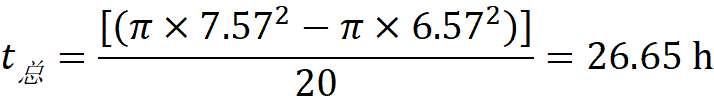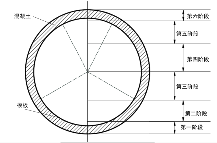 将浇筑过程按混凝土的终凝时间主要离散为6个阶段,拟浇筑混凝土如图9所示为外半径7.57m、内径半6.57m、长12m的一个圆柱体,由于浇筑速度大约为20m3/h,因此总浇筑时间t总为: