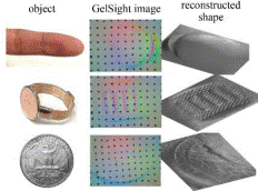 回答:前端采用光度立体法:硅胶上有阵列排布的小孔,接触物体表面后硅胶上小孔形变,其背后摄像机拍摄到形变通过求解泊松方程得到接触力的信息,进而还原表面形貌。