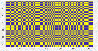 制作无镜头相机首先需要加工出符合规律的振幅掩膜板。掩膜板可以被视为一个矩阵,其中透光的部分数值为0,不透光的部分数值为1。阅读文献后可知,符合规律的掩模版矩阵是由两个 M 序列的外积并将矩阵元素中的-1赋值为0生成。本人使用MATLAB生成M 序列并进行外积操作,获得了多种规格掩模版矩阵及其示意图。