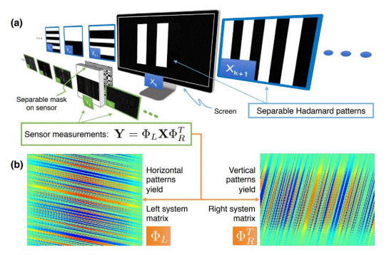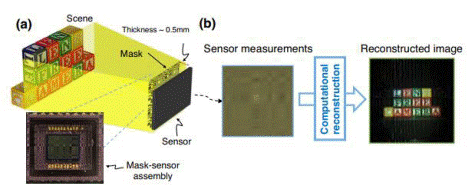 FlatCam 是一款新型的无镜头相机,相机由振幅掩膜板以及一个 RGB 光学传感器叠加组成,场景反射光通过掩膜板后在传感器上形成由多个小孔成像叠加后的图案。