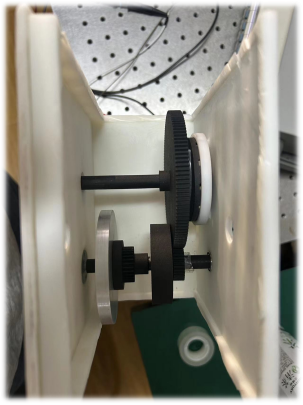发条集能器模块主要机构如图所示,发条放置在发条盒中,通过大齿轮所在的轴固定。行人走路时,通过拉动细线的方式带动大齿轮轴旋转,此时发条开始上紧,由于棘轮的原因,虽然大小齿轮相互啮合,但是大齿轮轴并不会带动电机轴转动。当行人完成一次放脚,细线收回发条开始释能,此时大齿轮轴反向旋转,通过与小齿轮的啮合,将旋转圈数放大的同时带动电机轴进行转动,电机轴通过联轴器连接带动电机转动,同时利用飞轮保持一定时间的旋转,这样就将人体运动的生物能,转化成了弹性势能,再转化成机械能,最后转化成电能供给后续使用。