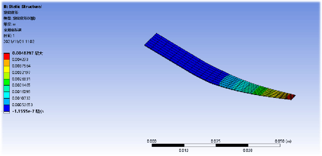 对于钢片来说,需要通过Ansys软件对其进行静力学分析,设计对应发条最终拉力14N时,挠度为1mm左右的钢片。
