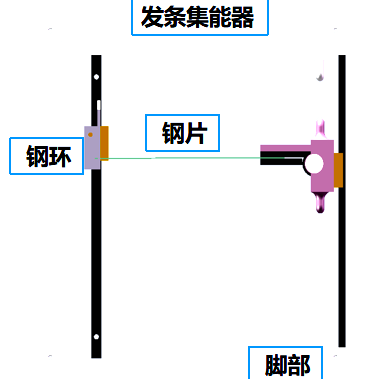 如图所示,左侧钢环连接上方发条集能器,右侧连接人体脚部,脚部向下带动右侧钢片夹向下运动,钢片夹向下带动钢片,钢片与钢环接触产生挠度,直至下降到要求距离,发条力达到设定值,钢片弯曲与钢环发生分离,钢环向上运动发条释能。