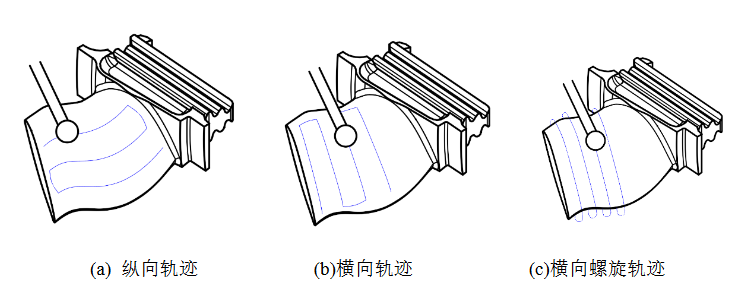 主要有纵向、横向、横向螺旋三种轨迹,如图9所示。考虑叶片加工后的表面纹路对叶片工作性能的影响,为保证表面加工纹路与燃气流动方向的一致性,提高叶片的气动性能,选取横向螺旋轨迹。