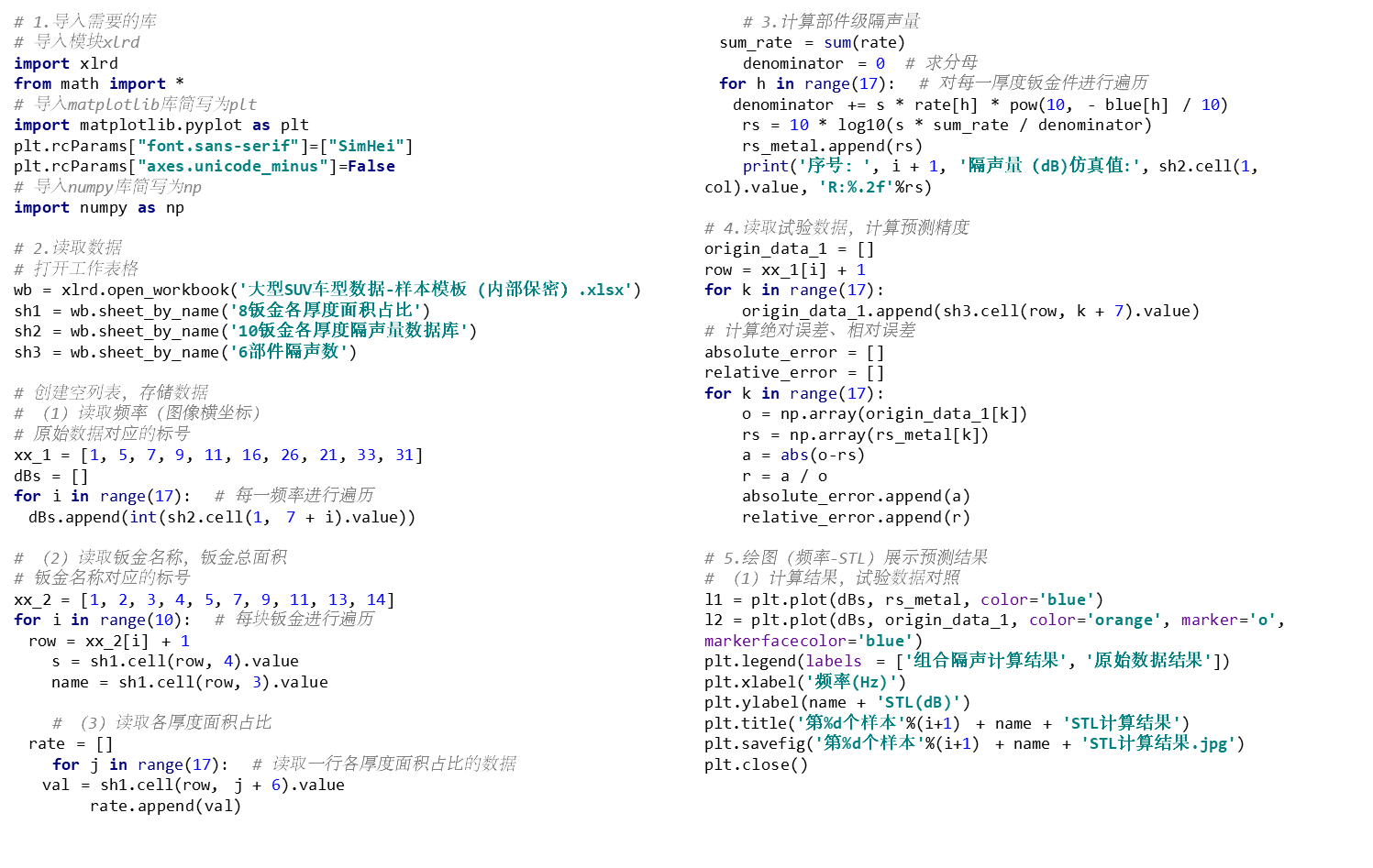 应用Python编程,先读取声学包隔声性能参数(如各厚度面积占比、各厚度隔音量),然后利用for嵌套循环语句进行部件级隔声量计算,最后绘制频率-STL图像,以及绝对误差、相对误差图像,验证预测模型的有效性。