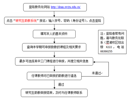 2. 相关注意事项: (1)本学期博士研究生助教申报起止日期:3月6日—3月11日 (2)同学们在填报个人资料及所申报课程相关信息时,应尽量详细并可填写本人相关课程的成绩,以增加被老师录取的几率。 (3)建议教师每天登陆教务网遴选研究生助教,建议研究生每天登录系统一次,查询本人是否被录取,若未通过,可及时重新提交申请。 (4)上学期部分考核不合格的博士研究生助教将取消本学期的申报资格,并根据情况在本学期劳酬中扣除上学期已发的劳酬,如有疑问可咨询教务处(王老师 66366255)。 欢迎广大博士研究生加入研究生助教的大家庭,展现你的风采、发挥你的才能、锻炼你的能力、丰富你的研究生经历!