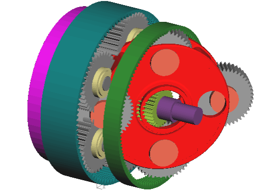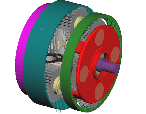 先简要推导模态分析的理论分析过程,目的是为了得到各阶的固有频率。一般研究着眼于较低固有频率,本次研究以200Hz为边界,通过仿真发现其前28阶固有频率为0,为刚体模态,无研究分析意义,同时分析该系统模态振型图,总结出三类振动模式,分别为高速级行星轮系与低速级太阳轮轴耦合振动模式、高速级行星轮系振动模式和低速级行星轮振动模式。如图所示为对应振动模式典型振型图。