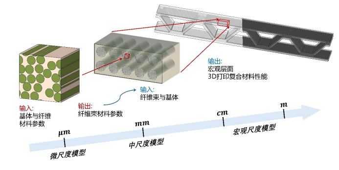 多尺度方法是研究复合材料性能的常用方法,通过将宏观结构与微观结构特征相耦合的方式,将复合材料划分为不同的尺度层次,逐层分析与建模,实现多尺度的全面分析。本文使用一种顺序多尺度的建模方法来构建连续纤维3D打印夹层结构的有效性能以及组分性能和微观组织参数之间的关系。将连续纤维夹层结构复合材料分为基体和纤维束两个组分,利用多尺度的方法计算纤维束的各向异性力学性能,从而进一步计算宏观层面复合材料的力学响应。