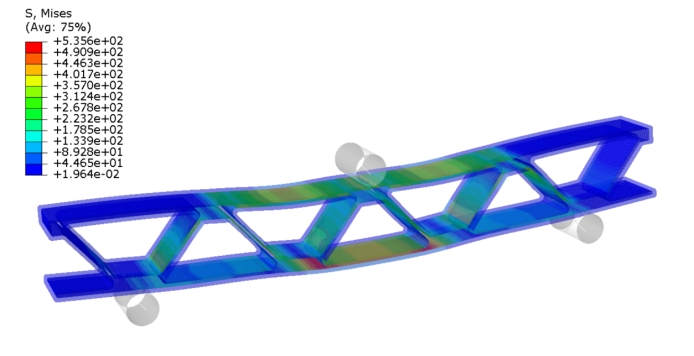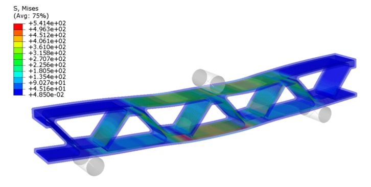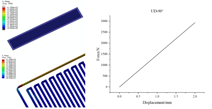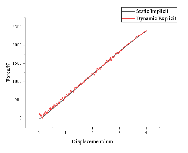分别使用显式动力学与隐式静力学两种求解器对有限元模型进行了求解验证,完成了有限元仿真工作,在不考虑损伤的情况下,得出近似线性的力-位移关系,为后续进一步评价弯曲性能奠定了基础。