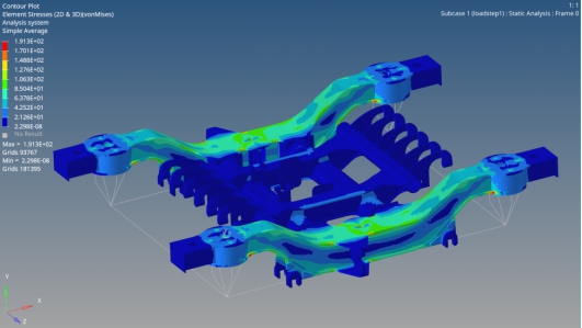 2.将建立的构架模型导入Hypermesh中完成了几何清理、网格划分,利用Optistruct优化求解器进行了初步分析,并获得了初步的von Mises应力云图,如图3所示。当前只是初步结果,后续将继续按任务要求进行优化。