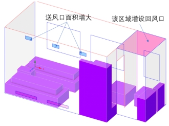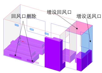 根据包厢冬夏两种工况的温度、速度分布的分析结果,卫生间处存在冷热不均现象,夏季较热,冬季较冷,且包厢内整体风速较大。根据上述特点,优化方案如下图所示。