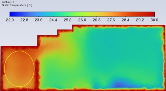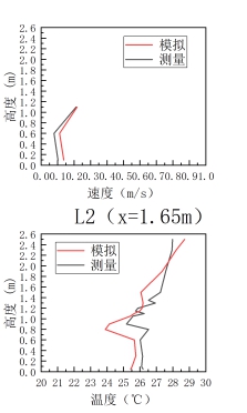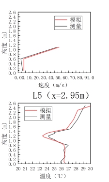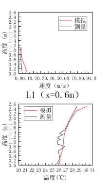 总体而言,预测气流速度和温度的变化规律与实验测量结果相似,但在某些测点数值方面有差异。在研究中,速度最大误差所在处为接近地板非人员核心区域,而在人员核心区域(>0.5m),速度平均误差为12%,温度平均误差为2.8%,最大误差为4.8%,均小于15%。因此,本研究采用的 CFD 方法是有效的。