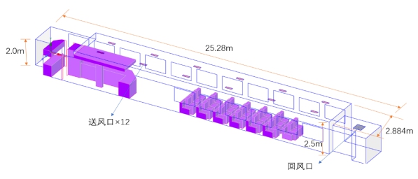 1.根据先前对基准工况气流组织效果分析和初步的优化方案,改进客厅车和包间车对应模型,并计算优化方案对应的送风参数(1周);