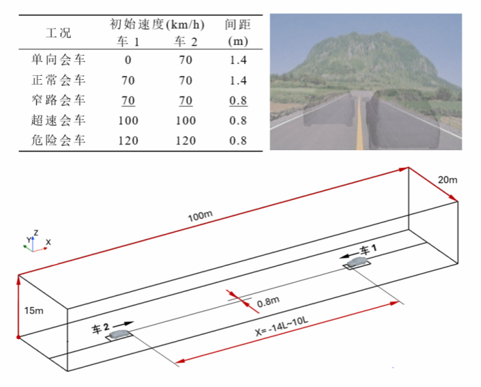 在没有限速标志、标线且同方向只有1条机动车道的公路上,汽车最高行驶速度为70km/h。考虑占道、窄路、超速,根据实际会车时两车各自的速度,以及横向间距,可区分出单向、正常、窄路、超速、危险五种会车工况。综合比较几种工况出现频次、引起振动的大小,决定选用窄路会车工况进行仿真,两车速度70km/h、间距0.8m。参考以往的研究,流场计算域的外形尺寸设置成100×20×15m,会车范围设置成X/L=-14~10。