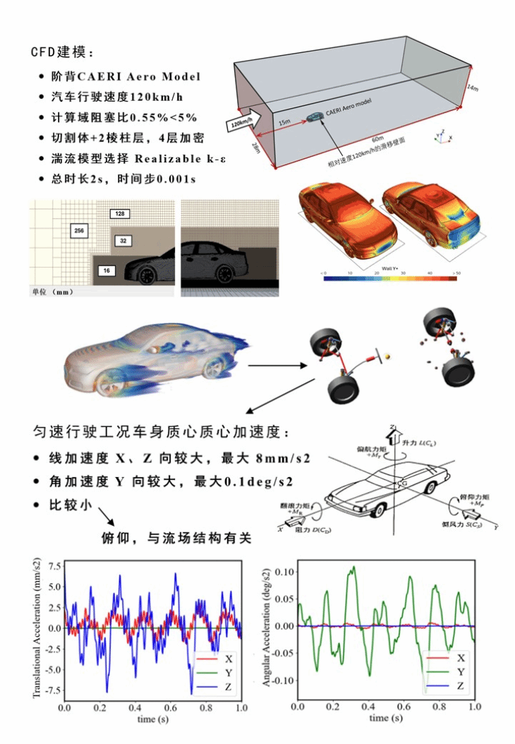 整车模型选用CAERI Aero Model,运用单向软件耦合法。先用STAR-CCM+仿真汽车周围的瞬态流场,输出车身质心处的气动力,再把气动力以样条函数载荷形式加载到Adams/Car整车模型的车身质心,由整车动力学仿真得到车身各方向的振动加速度,并结合流场结构对其特点进行分析。