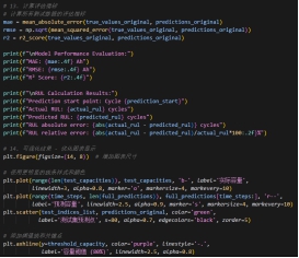 在设定的预测起点开始预测,拟合程度较高,MAE,RMSE较小,R²接近1,说明拟合程度高,同时计算出来的RUL误差只有1.6%,说明模型的可靠度较高。