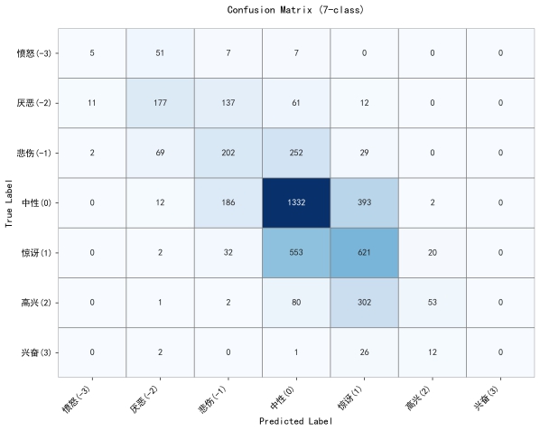 3.best model在分类任务中(七分类、正负二分类和非负,负二分类)的Precision、Recall、F1-Score、accuracy 、macro avg、weighted avg以及最终的混淆矩阵;